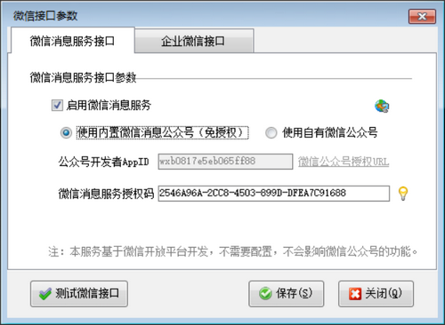 在功能導航窗點擊“擴展應用”,打開“微信接口參數(shù)”進行配置。支持內(nèi)置微信消息公眾號和自有微信公眾號發(fā)送兩種方式,如下圖所示: