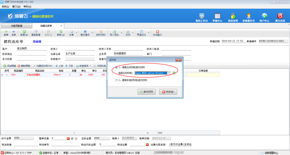 在業(yè)務(wù)單據(jù)中,進(jìn)行打印時(shí),軟件會提示使用云打印機(jī)進(jìn)行打印,還是通過本地打印機(jī)進(jìn)行打印。
