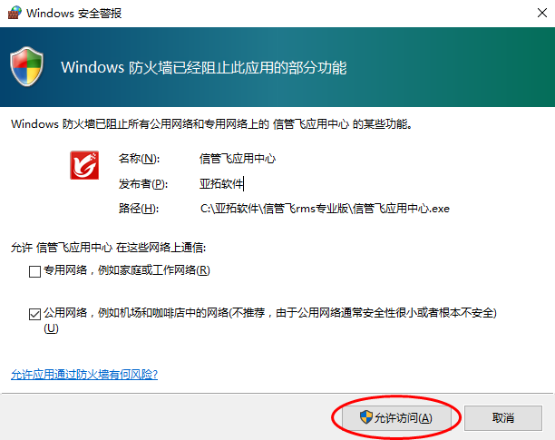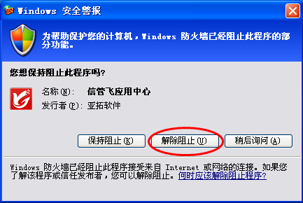 ????首次運行應用中心程序,如果防火墻彈出提示窗口,則Win7系統請點擊“允許訪問”按鈕允許訪問;WinXP系統請點擊“解除阻止”按鈕即可。