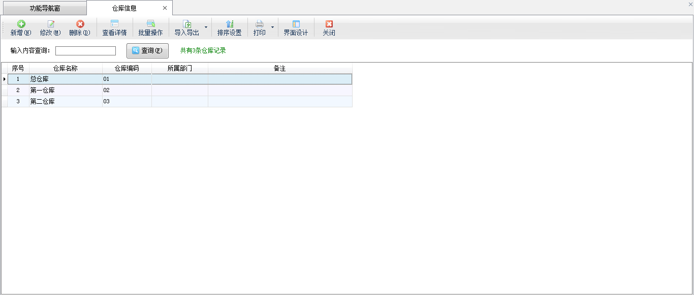 ????在功能導(dǎo)航窗點擊“基礎(chǔ)資料”—》“倉庫信息”,即可進入倉庫信息管理功能,其界面如下圖所示: