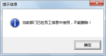 刪除部門:對選定的部門信息進行刪除。如果部門已使用則不允許刪除,可以先將相應(yīng)員工的所屬部門調(diào)整為其他部門,然后才可以刪除。