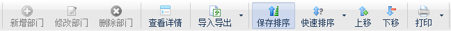排序設(shè)置:點“排序設(shè)置”按鈕后,進入排序模式,軟件會顯示“快速排序”、“上移”、“下移”等功能按鈕。點擊生成快速排序、上移、下移三種方式,“快速排序”可將其按照部門編碼、部門名稱自動生成順序;也可以選擇要調(diào)整的部門記錄,然后點擊“上移”、“下移”按鈕調(diào)整順序。