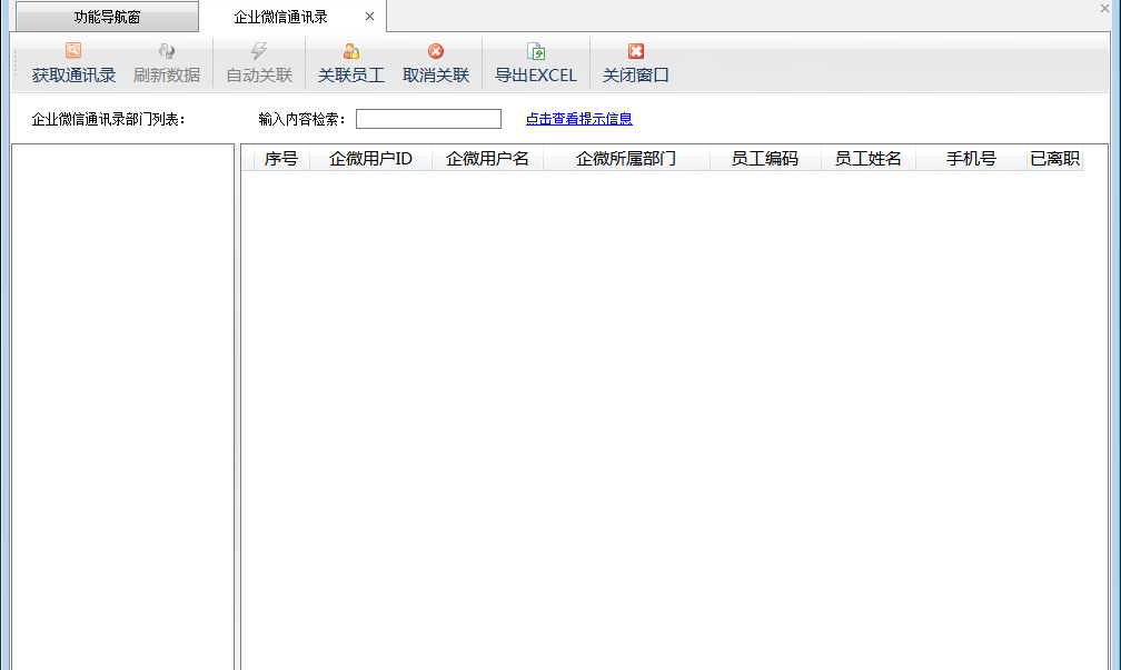 微信通訊錄:點擊“企微通訊錄”按鈕可以打開“企業(yè)微信通訊錄”窗口,可以獲取企業(yè)微信通訊錄信息,以及取消關(guān)聯(lián)員工等操作。(企微通訊錄功能需要先在“擴展應(yīng)用”—》“微信接口參數(shù)”內(nèi)對“企業(yè)微信接口”配置后才可以使用。)