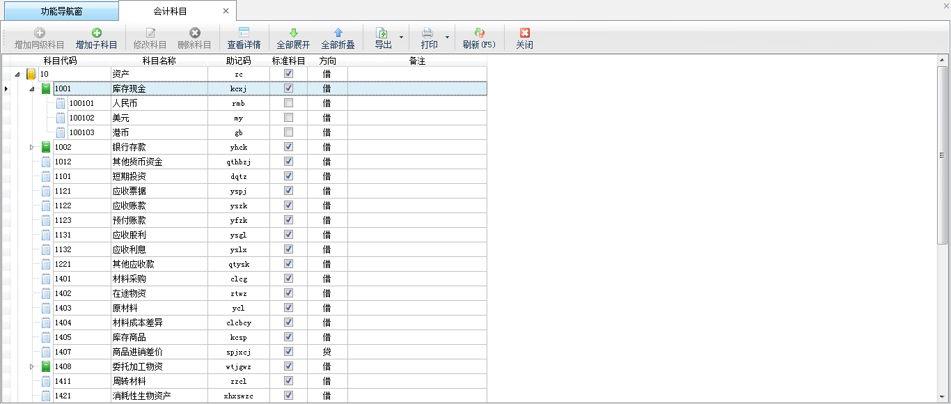 增加會計科目:點“增加同級科目”或“增加子科目”按鈕可以增加會計科目。增加科目的時候,請注意科目的方向。如默認(rèn)資產(chǎn)類科目的方向為“借”,請根據(jù)情況修改調(diào)整。科目代碼會自動遞增,可根據(jù)需要進行修改調(diào)整。