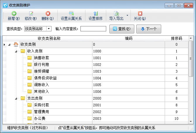 ????在功能導(dǎo)航窗點擊“基礎(chǔ)資料”—》“收支類別維護”,即可進入收支類別維護功能,其界面如下圖所示: