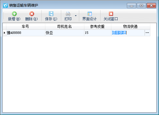 ????在功能導(dǎo)航窗點擊“基礎(chǔ)資料”—》“銷售運輸車輛”,即可進入運輸車輛維護功能,可以對運輸車輛及其參考皮重、司機姓名、所屬物流公司進行維護(有地磅稱重管理模塊即可使用此功能),其界面如下圖所示:
