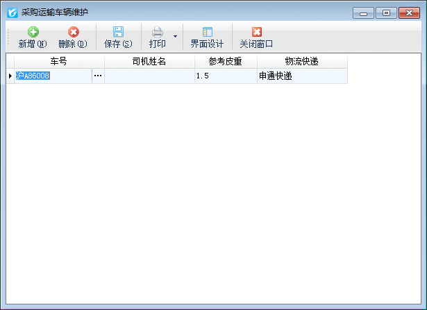 ????在功能導(dǎo)航窗點擊“基礎(chǔ)資料”—》“采購運輸車輛”,即可進入采購運輸車輛維護功能,可以對運輸車輛及其參考皮重、司機姓名、所屬物流公司進行維護(有地磅稱重管理模塊即可使用此功能),其界面如下圖所示: