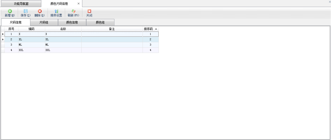 ????在功能導(dǎo)航窗點擊“基礎(chǔ)資料”—》“顏色尺碼信息”,即可進入顏色尺碼信息管理功能,其界面如下圖所示:
