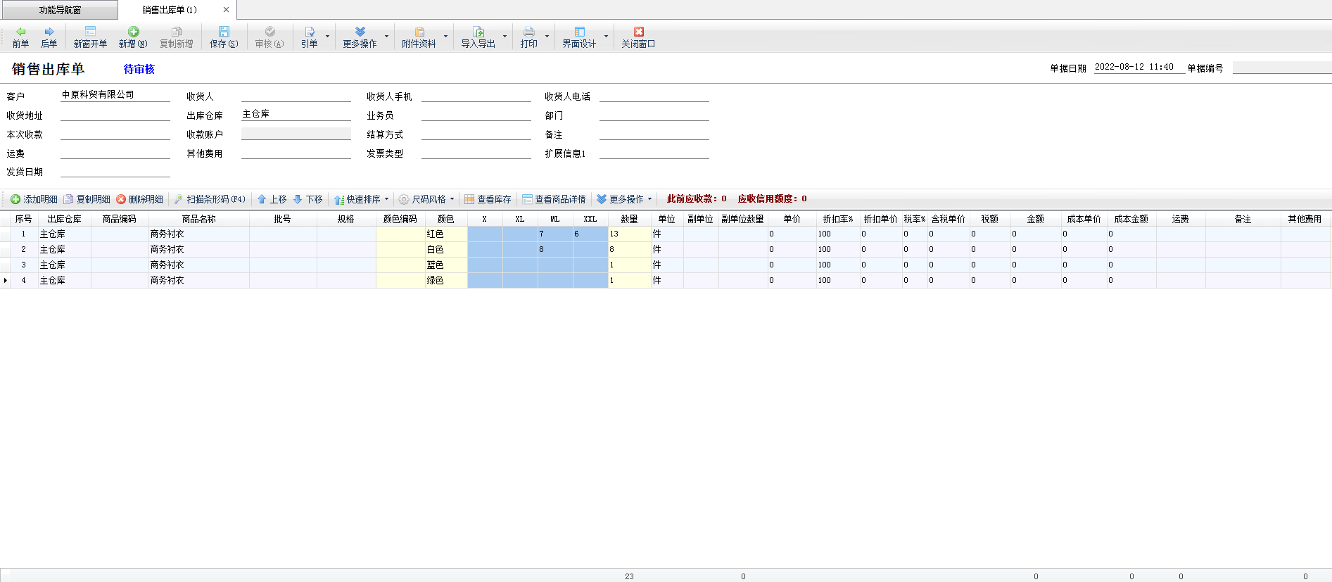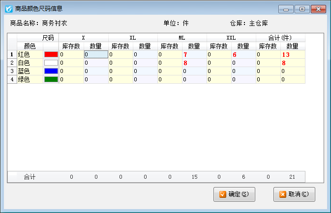 ????軟件支持按顏色組和尺碼組進行管理,方便不同的商品直接選擇不同的顏色尺碼組。在業(yè)務(wù)單據(jù)錄入時,軟件提供尺碼橫向錄入和彈出窗口錄入數(shù)量,如下圖所示: