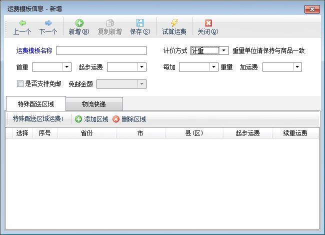 新增:在工具欄點擊“新增”按鈕可以新增運費模板信息,計價方式支持“計件”和“計重”兩種方式,特殊配送區(qū)域標(biāo)簽頁可以添加特殊區(qū)域設(shè)置當(dāng)前區(qū)域的起步運費和續(xù)重運費,物流快遞標(biāo)簽頁可以添加使用此運費模板的物流快遞。
