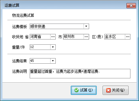 試算運費:在工具欄點擊“試算運費”按鈕可以打開試算運費窗口,在此窗口選擇運費模板后,輸入收貨區(qū)域以及重量/件數(shù)后可以自動根據(jù)選擇的運費模板計算運費。