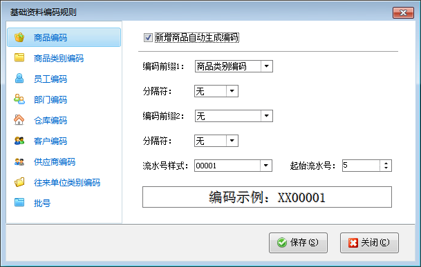 ????可設(shè)置商品,商品類別、客戶,供應(yīng)商,員工等編碼的是否可自動生成以及可組合前綴(如關(guān)聯(lián)商品類別編碼)與流水號,配置分隔符、流水號格式及起始值,形成完整編碼規(guī)則。