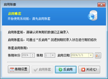 啟用賬期:是指準(zhǔn)備從哪個月份開始使用軟件(舉例:假設(shè)當(dāng)前月份為2025年4月份,但我們想從2025年2月份開始使用軟件,可以將啟用賬期設(shè)置為2025年、賬期為2,這樣我們需要整理的期初數(shù)據(jù)就應(yīng)該是截止到2025-02-01前的期初應(yīng)收應(yīng)付款、期初商品庫存,開賬后就可以錄入2025-02-01之后的業(yè)務(wù)單據(jù))。