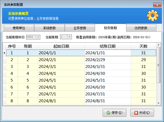 賬期設(shè)置:點“賬期設(shè)置”按鈕可以設(shè)置每個賬期的起始日期。每年共12個賬期,默認(rèn)是按照自然月劃分賬期。