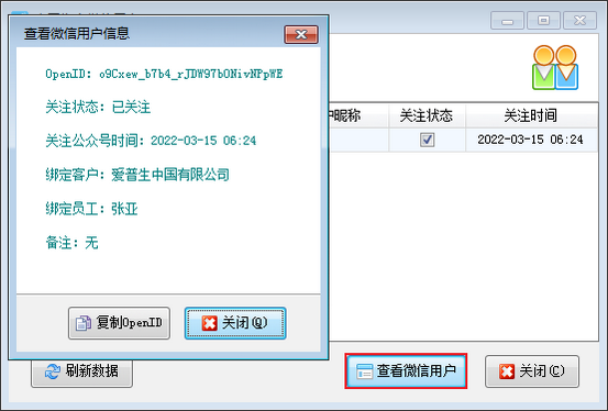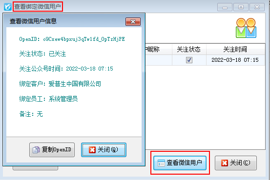 ????(2)選擇查看綁定微信用戶,可以查看綁定微信用戶的服務(wù)信息,點擊查看微信用戶,查看微信用戶的詳細信息。