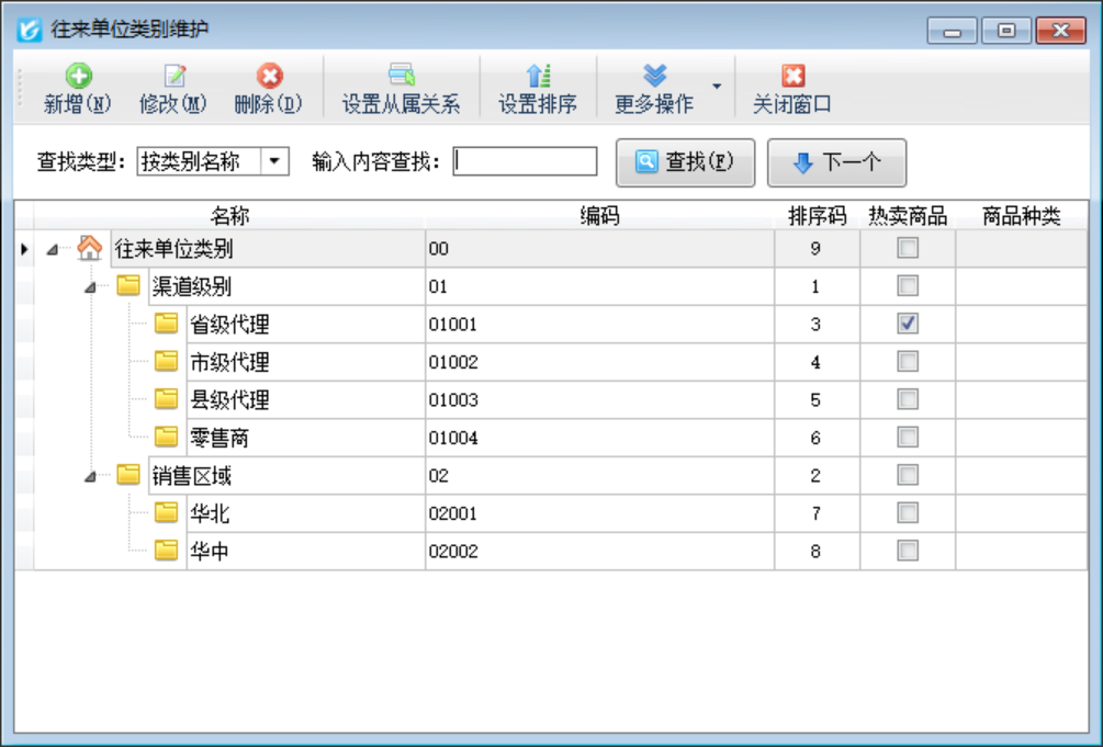 單位類別:點工具欄中的“單位類別”按鈕,可以維護往來單位類別。客戶資料和供應(yīng)商資料共用“往來單位類別”。往來單位類別管理,包括維護單位類別、設(shè)置從屬關(guān)系、設(shè)置顯示順序(排序)、導(dǎo)入Excel數(shù)據(jù)等功能。