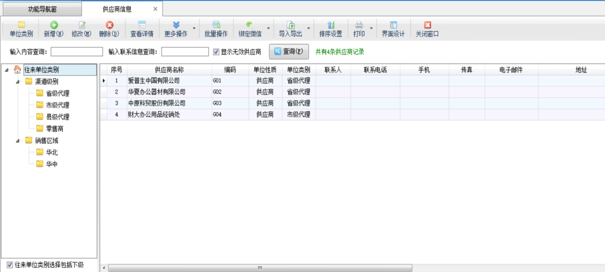 ????在功能導(dǎo)航窗中點擊“基礎(chǔ)資料”—》“供應(yīng)商信息”,即可進入“供應(yīng)商信息”功能,其界面如下圖所示: