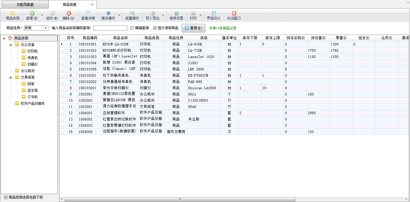 商品類別:點工具欄中的“商品類別”按鈕,可對商品的分類進行維護。