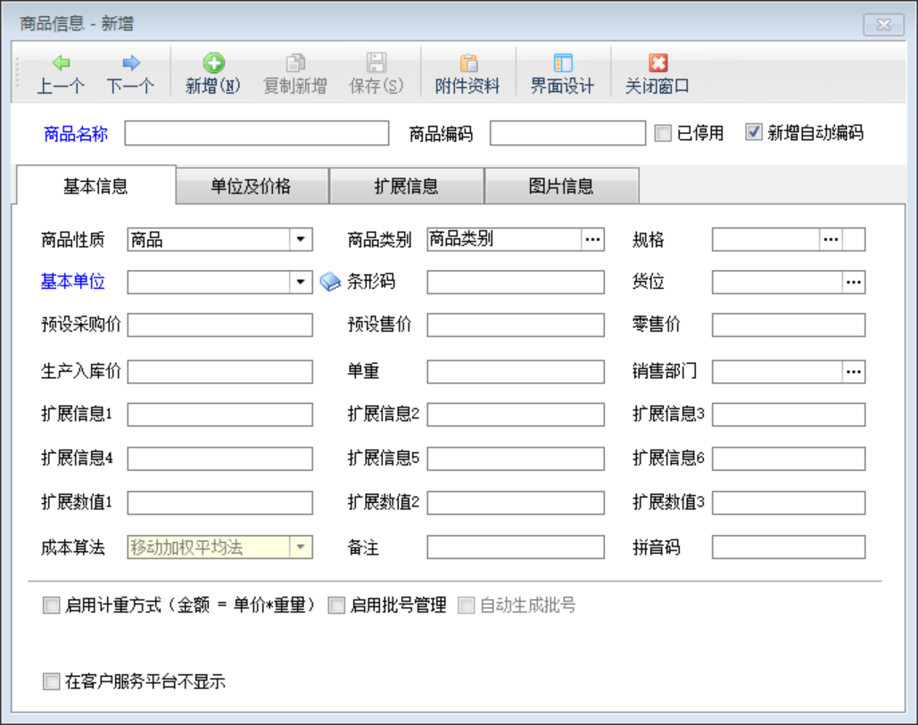 成本算法:軟件支持三種成本核算方法(移動加權(quán)平均法、先進先出法和手工指定法),每種商品都可選擇不同的成本核算方法,為減少軟件計算工作量,建議選擇相同的成本算法。
