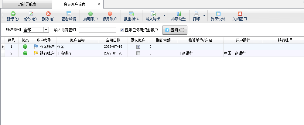 ????資金賬戶信息中可維護單位的現(xiàn)金賬戶和銀行賬戶,每個資金賬戶需要對應(yīng)一個資產(chǎn)類的會計科目(庫存現(xiàn)金或銀行存款下的子科目)。在業(yè)務(wù)開單時,選擇收付款賬戶時調(diào)用“資金賬戶信息”中維護的資金賬戶。