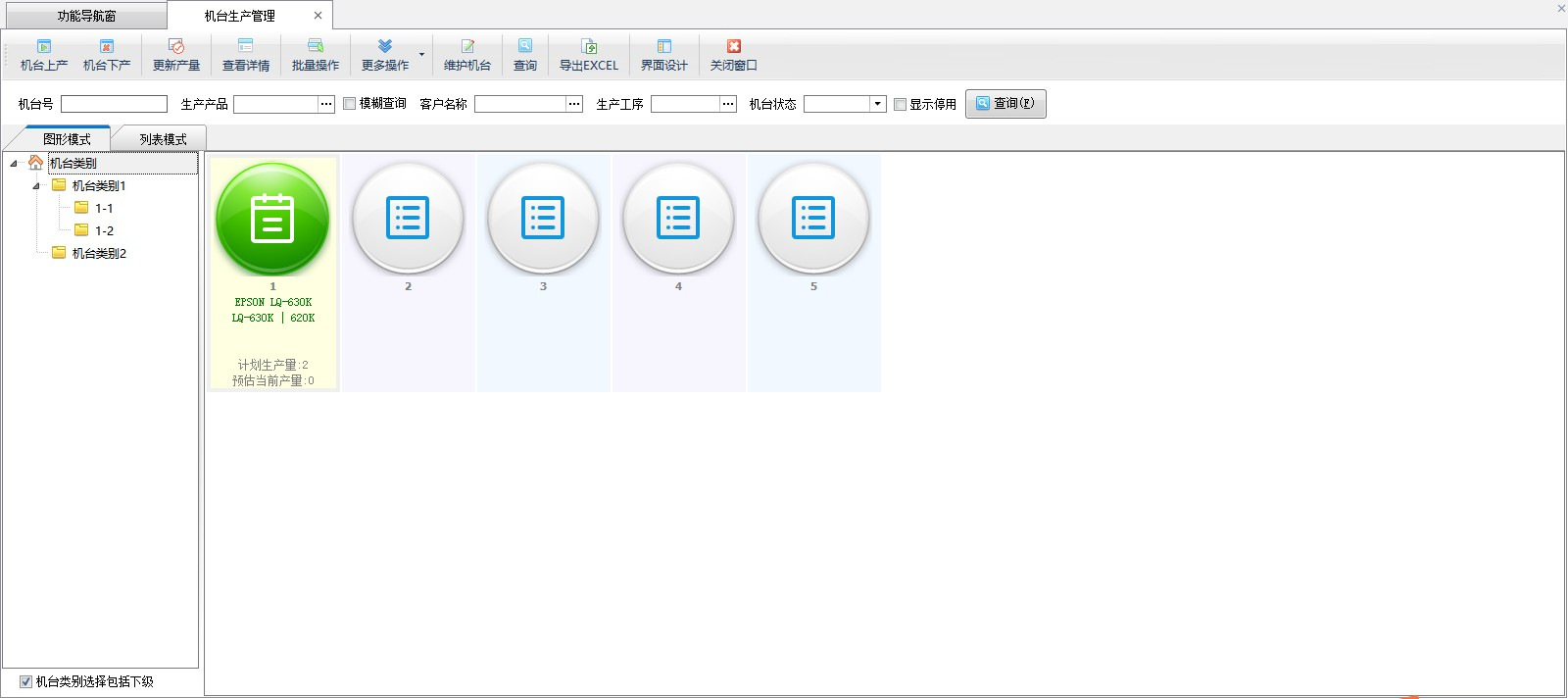 ????在功能導航窗點“生產管理”—》“機臺生產管理”即可進入“機臺生產管理”界面。機臺生產管理以圖形模式和列表模式兩種方式顯示機臺的生產管理情況,可以查看機臺狀態、機臺號、計劃生產量信息,如下圖所示: