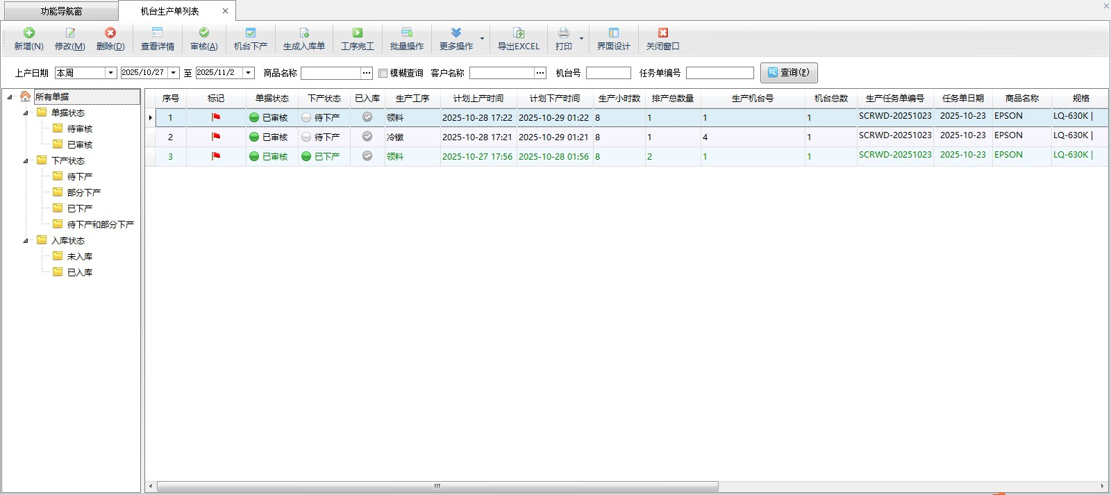 機臺下產明細查詢:可根據生產工序、生產產品、機臺號、下產狀態等條件查詢某個時間段內,工序本次計劃生產量、下產數量。