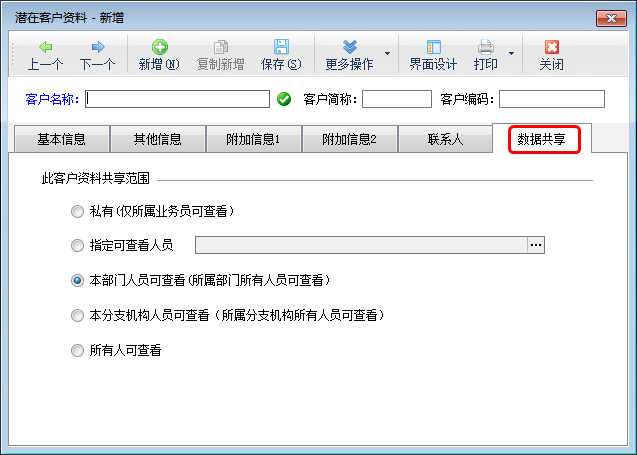 ????(3)在“數據共享”標簽頁可以設置此客戶資料的共享訪問,即具體哪些人員可以查看這個潛在客戶信息。