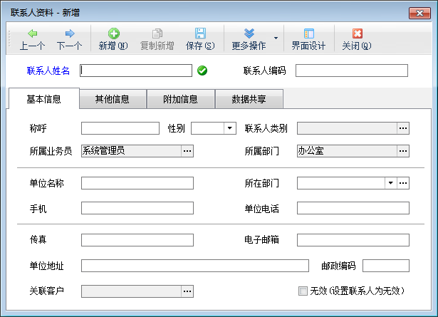 新增聯系人:點工具欄中的“新增”按鈕可以增加聯系人。聯系人信息中除“姓名”外其他數據項都不是必須填寫。軟件支持聯系人查重功能,可以查詢是否有疑似重復的聯系人。