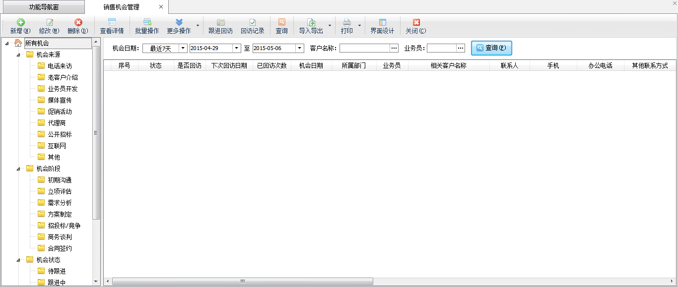 ????在功能導航窗,點“客戶關系”—》“銷售機會”,即可進入銷售機會管理界面,如下圖所示: