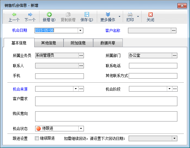 新增銷售機會:點工具欄中的“新增”按鈕可以增加銷售機會記錄。銷售機會中可以關聯潛在客戶,如果是新的潛在客戶,也可以直接錄入新客戶。機會錄入日期、潛在客戶、機會來源為必填寫字段。