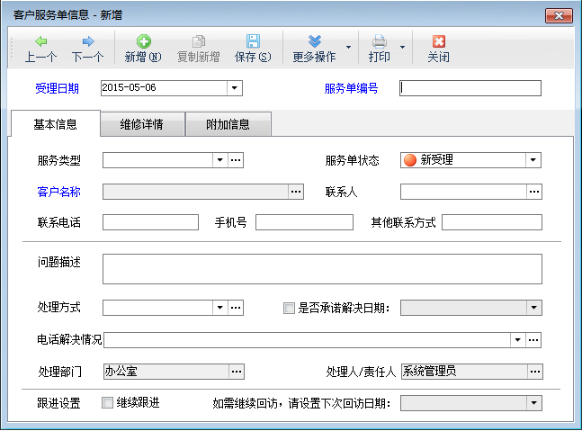 新增服務單:點工具欄中的“新增服務單”按鈕,可以增加服務單信息。在受理階段需要填寫受理日期、服務單編號、服務類型、相關客戶和聯系人、問題描述等信息。如果是保修產品性質的客戶服務,還需要登記故障產品的信息。