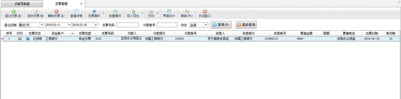 ????支票管理功能主要包括登記支票、修改支票、刪除支票、查看支票詳情、導(dǎo)入導(dǎo)出支票數(shù)據(jù)、打印支票、刷新支票列表。