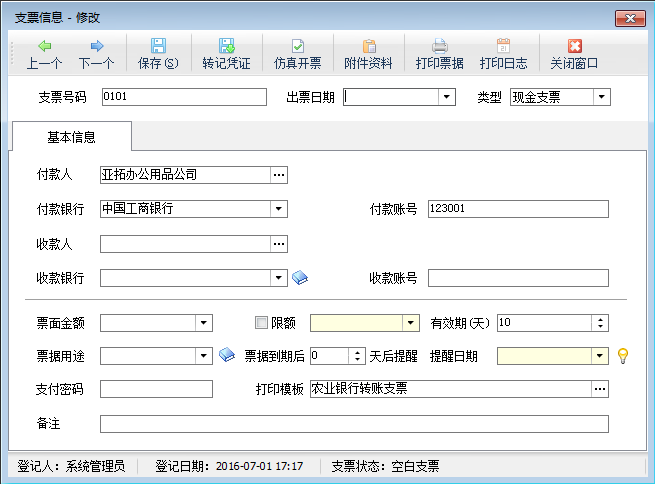 ????用于修改一個(gè)支票的信息。在“支票管理”界面,單擊工具欄中的“修改支票”按鈕,彈出修改支票窗口,修改支票信息后點(diǎn)擊“保存”按鈕進(jìn)行保存。修改支票的界面可以進(jìn)行仿真開(kāi)票、打印支票,可以查看打印日志。