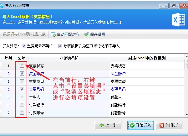 必填數(shù)據(jù)項(xiàng):在當(dāng)前行,右鍵點(diǎn)擊“設(shè)置必填項(xiàng)”或“取消必填標(biāo)志”可設(shè)置本數(shù)據(jù)項(xiàng)是否必填。對(duì)于設(shè)置為必填的數(shù)據(jù)項(xiàng),如果 EXCEL 中對(duì)應(yīng)的數(shù)據(jù)為空則不能導(dǎo)入。