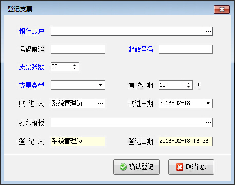 ????點(diǎn)擊工具欄中的“登記支票”按鈕,系統(tǒng)彈出“登記支票”窗口,如下圖所示,用戶錄入支票相關(guān)數(shù)據(jù)項(xiàng)后,系統(tǒng)自動(dòng)生成指定張數(shù)的空白支票。