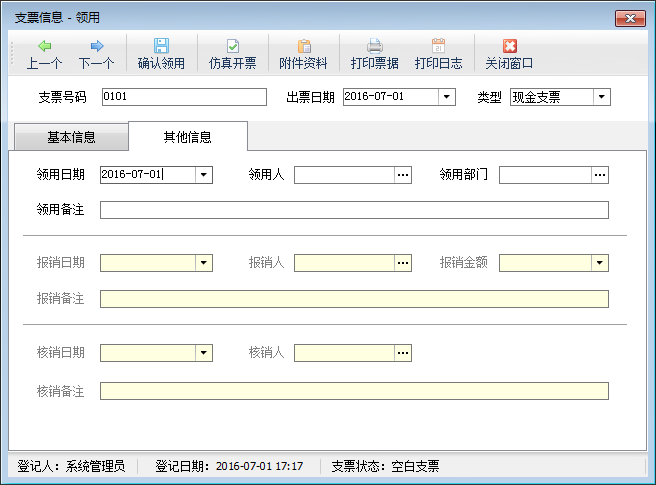 ????其他票據(jù)管理可以對(duì)其他票據(jù)進(jìn)行從登記支票—》領(lǐng)用支票—》核銷(xiāo)支票的流程化管理,可以查看所有其他票據(jù)使用的匯總數(shù)和明細(xì)。