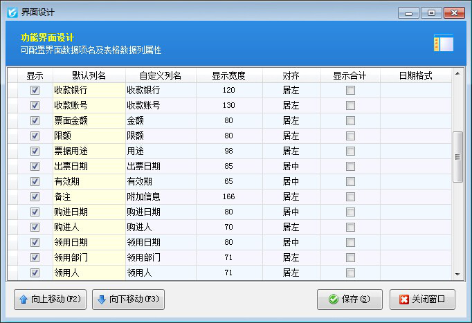 ????用于配置支票列表數(shù)據(jù)列屬性(列名、列寬度、對(duì)齊方式、列順序、是否顯示等)。
