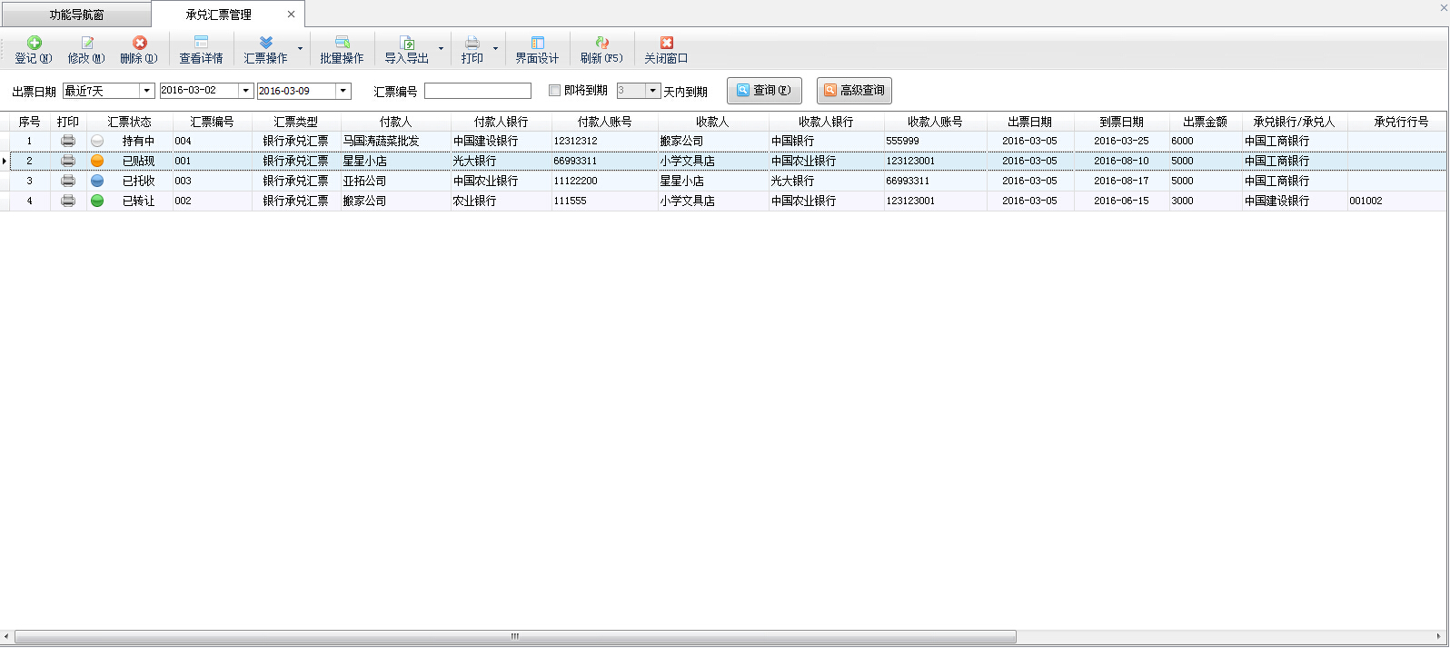 ????承兌匯票管理功能主要包括登記匯票、修改匯票、刪除匯票、查看匯票詳情、導(dǎo)入導(dǎo)出匯票數(shù)據(jù)、打印匯票、刷新匯票列表。