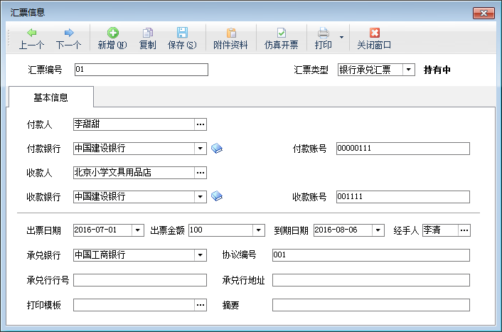 | 4 | 貼現(xiàn)匯票 | 選擇一個(gè)狀態(tài)為“持有中”的匯票,然后點(diǎn)擊工具欄中的“匯票操作”按鈕下拉菜單中的貼現(xiàn)匯票,系統(tǒng)打開(kāi)貼現(xiàn)匯票窗口,輸入付款人及貼現(xiàn)金額等信息后保存支票即可。匯票狀態(tài)為“持有中”的才可貼現(xiàn)匯票。 |