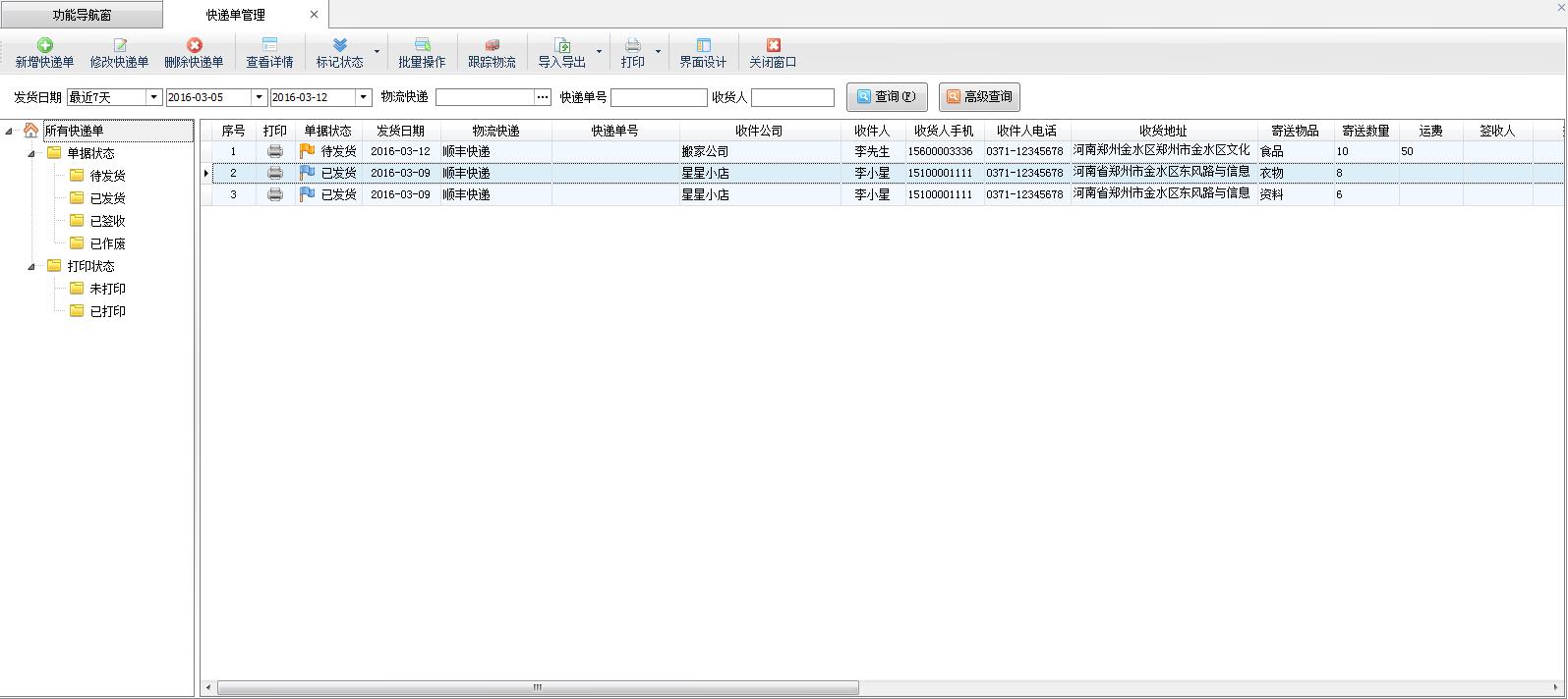 ????快遞單管理功能主要包括新增快遞單、修改快遞單、刪除快遞單、查看快遞單詳情、標(biāo)記快遞單狀態(tài)、導(dǎo)入導(dǎo)出快遞單數(shù)據(jù)、打印快遞單。
