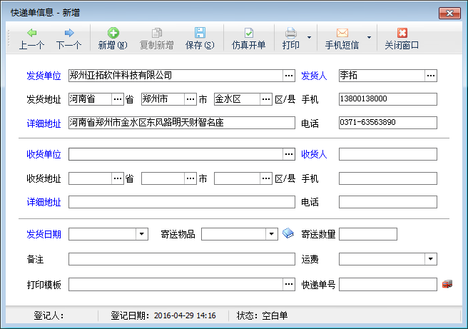 ????用于增加一個(gè)快遞單信息。在“快遞單管理”界面,單擊工具欄的“新增快遞單”按鈕,彈出如下窗口: