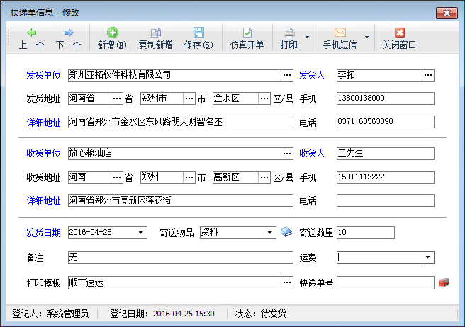 2、修改快遞單