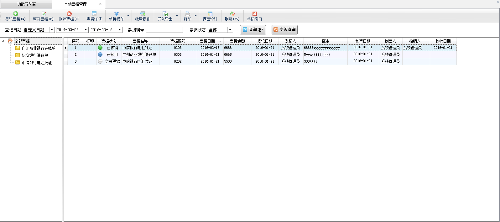 ????其他票據(jù)管理功能主要包括登記票據(jù)、填開(kāi)票據(jù)、刪除票據(jù)、查看票據(jù)詳情、導(dǎo)入導(dǎo)出票據(jù)數(shù)據(jù)、打印票據(jù)、刷新票據(jù)列表。