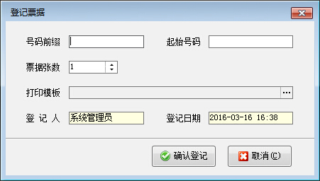 | 1 | 登記票據(jù) | 點(diǎn)擊工具欄中的“登記票據(jù)”按鈕,系統(tǒng)彈出“登記票據(jù)”窗口,用戶錄入票據(jù)的相關(guān)數(shù)據(jù)項(xiàng)后點(diǎn)擊“確認(rèn)登記”按鈕即可。 |