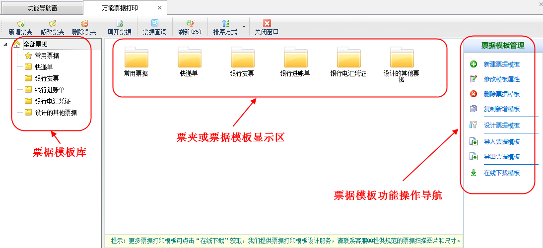 ????萬(wàn)能票據(jù)打印主要包括票據(jù)模板庫(kù)、打開(kāi)票據(jù)、查詢票據(jù)、批量打印、新增票據(jù)、設(shè)計(jì)票據(jù)、刪除票據(jù)、新建票夾、修改票夾、刪除票夾、導(dǎo)入票據(jù)、導(dǎo)出票據(jù)、刷新我的票據(jù)、常用票據(jù)設(shè)置。其中設(shè)計(jì)票據(jù)功能,我們會(huì)在專門(mén)的票據(jù)打印軟件說(shuō)明書(shū)里詳細(xì)介紹。