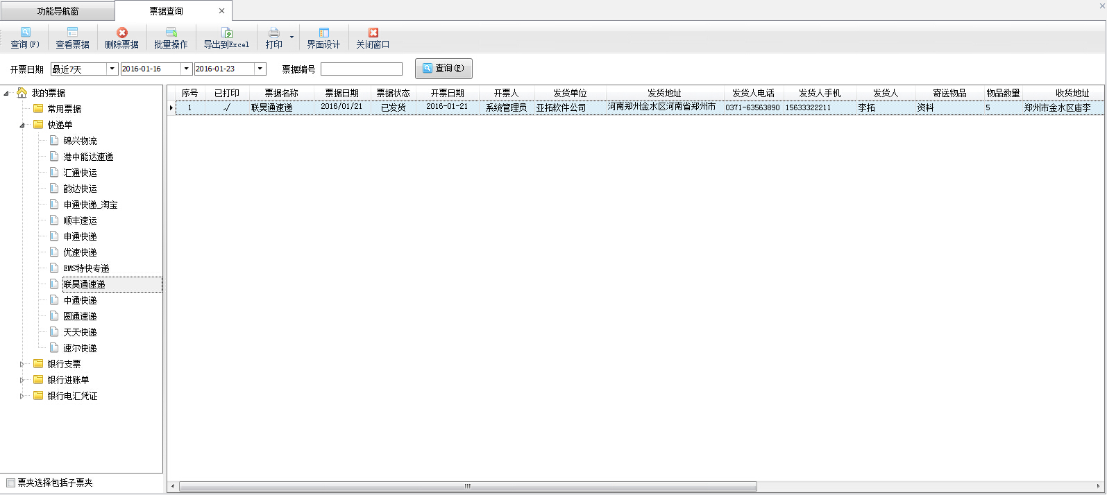 ????在功能導(dǎo)航窗中點(diǎn)擊“票據(jù)管理”—》“快遞單管理”,即可進(jìn)入“快遞單管理”界面,其界面如下圖所示:
