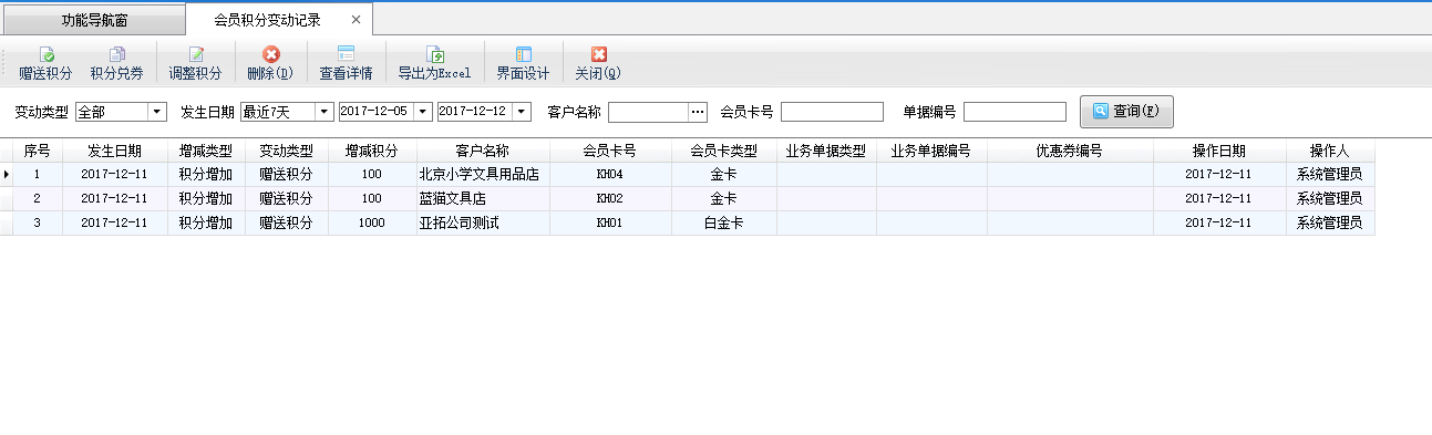 刪除積分變動記錄:在工具欄中點擊“刪除”按鈕,可以刪除積分變動記錄。刪除后當前會員卡的積分會回退,如是積分增加記錄,原積分 2000 分,增加 200 分,刪除此記錄后,積分會回退至 2000 分。
