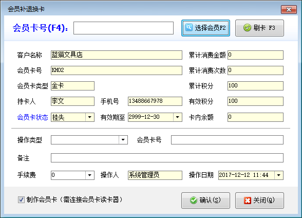 | 1 | 會員制卡 | 制作會員卡需連接會員卡讀卡器,輸入會員卡號后,點擊“確認制卡”按鈕即會員卡開卡成功;如沒有輸入會員卡號,系統將根據卡片硬件序列號自動生成會員卡號。 |