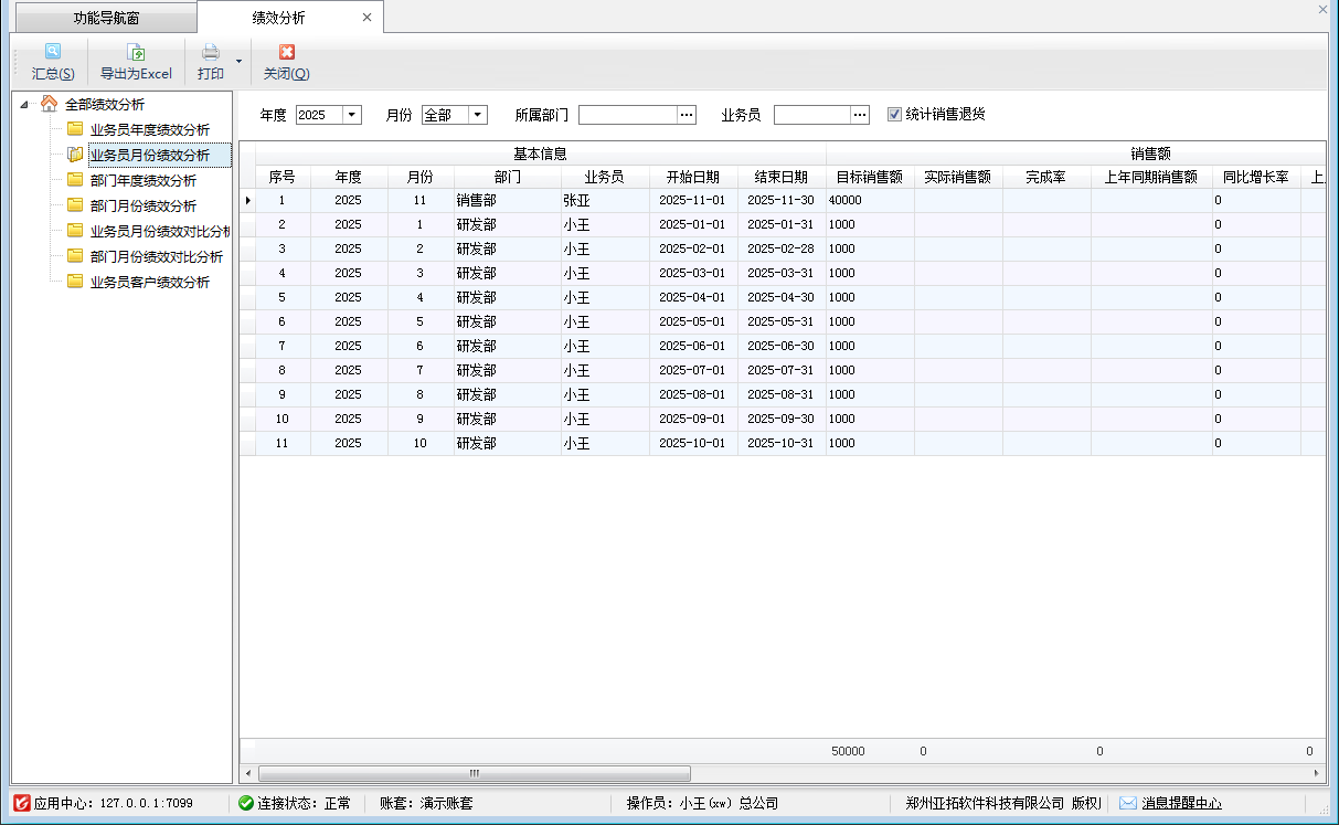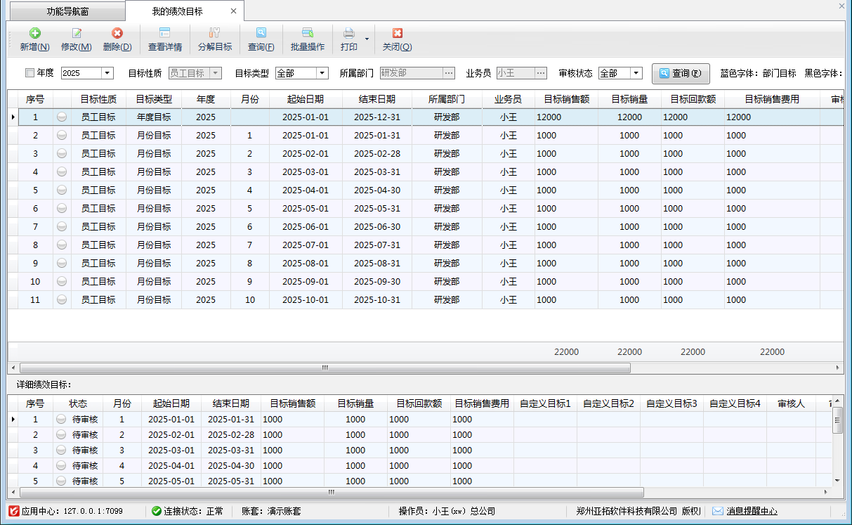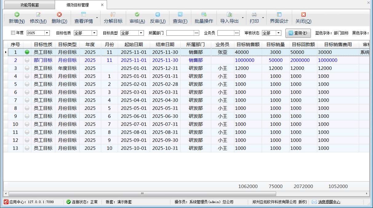 查詢:可以根據(jù)年度、目標性質(zhì)、目標類型、部門、業(yè)務員及審核狀態(tài)等條件查詢績效目標記錄。