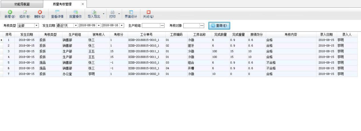 查詢:可以根據(jù)考核類型、發(fā)生日期、生產(chǎn)班組、考核對象等條件查詢質(zhì)量考核記錄。